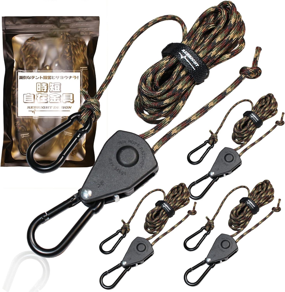 「ブラックカラビナ」&「キャンプに映える迷彩柄ガイロープ(3m)」&「収納時に便利なロープをまとめるテープ」の3点を標準装備しました。