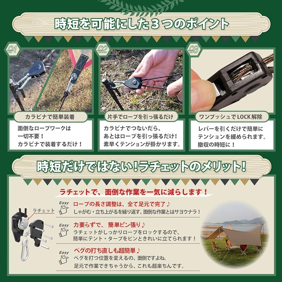 面倒なロープワークが不要。簡単にテントやタープ設営ができます。