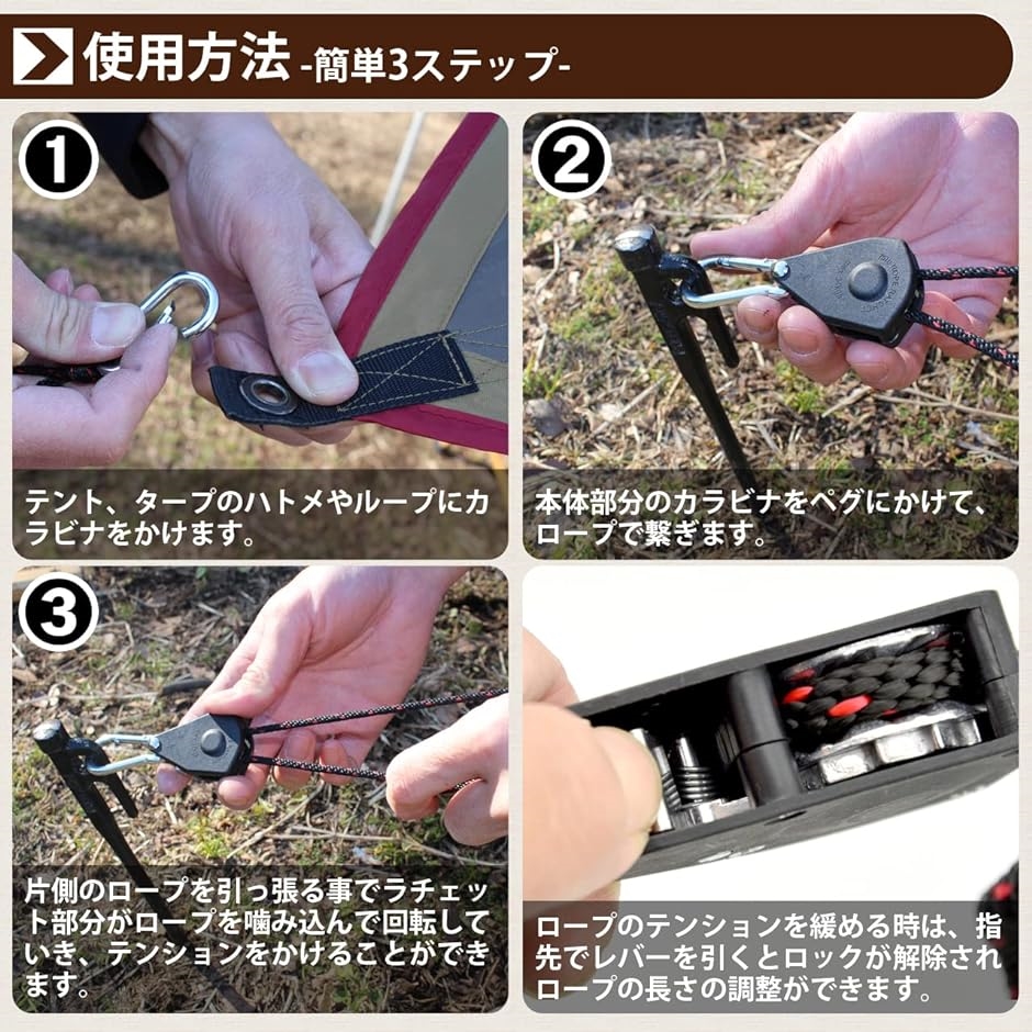 力不要で、手元の作業でテントやタープのロープにテンションを掛けられるので、お子様や女性でも簡単に使用できます。