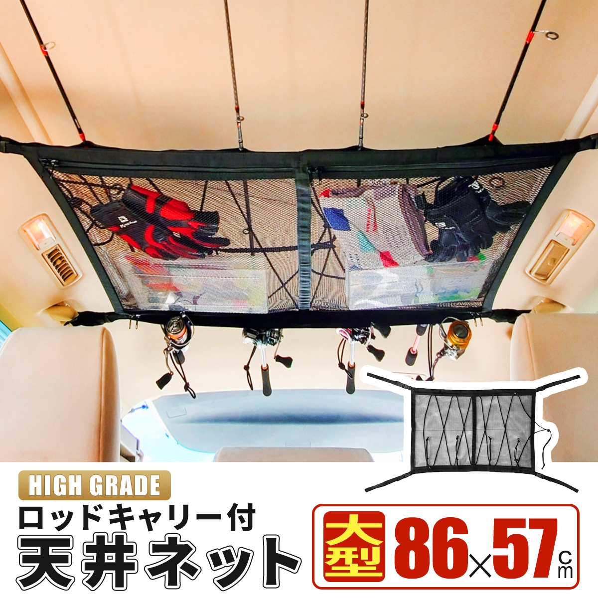 | 商品名 | R4年改良モデル 車 収納 ロッドキャリー ルーフネット ラゲッジネット 天井 ネット 車中泊 大型ネット 86x57cm 日本語取説付 |