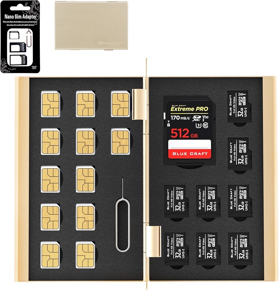 | 商品名 | BLUECRAFT SIM・SDカード 収納ケース アルミ両面タイプ 最大21枚収納 nanoSIM12枚 SD1枚 microSD8枚 SIM変換アダプタ 取出ピン付属 |