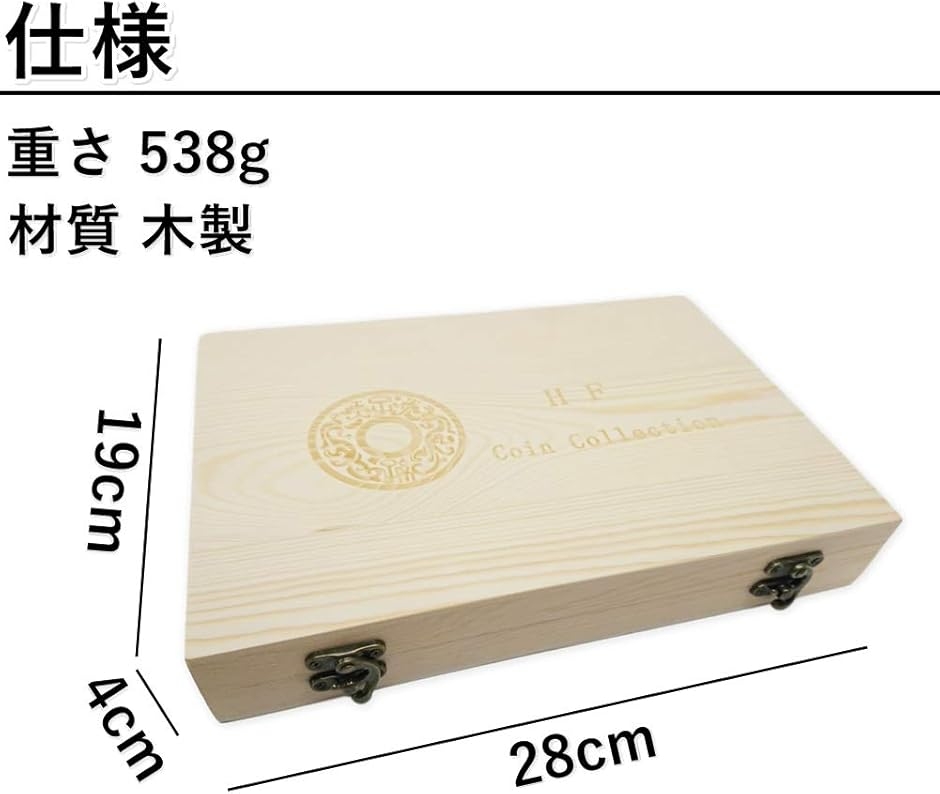 ・「サイズ」28 x 19 x 4.5 cm「重さ」538g 「材質」木製 「付属品」プラスチックコインケース アジャスター「収納例」古銭 記念硬貨 レアコイン 外貨 通貨 金貨 銀貨 銅貨 メダル