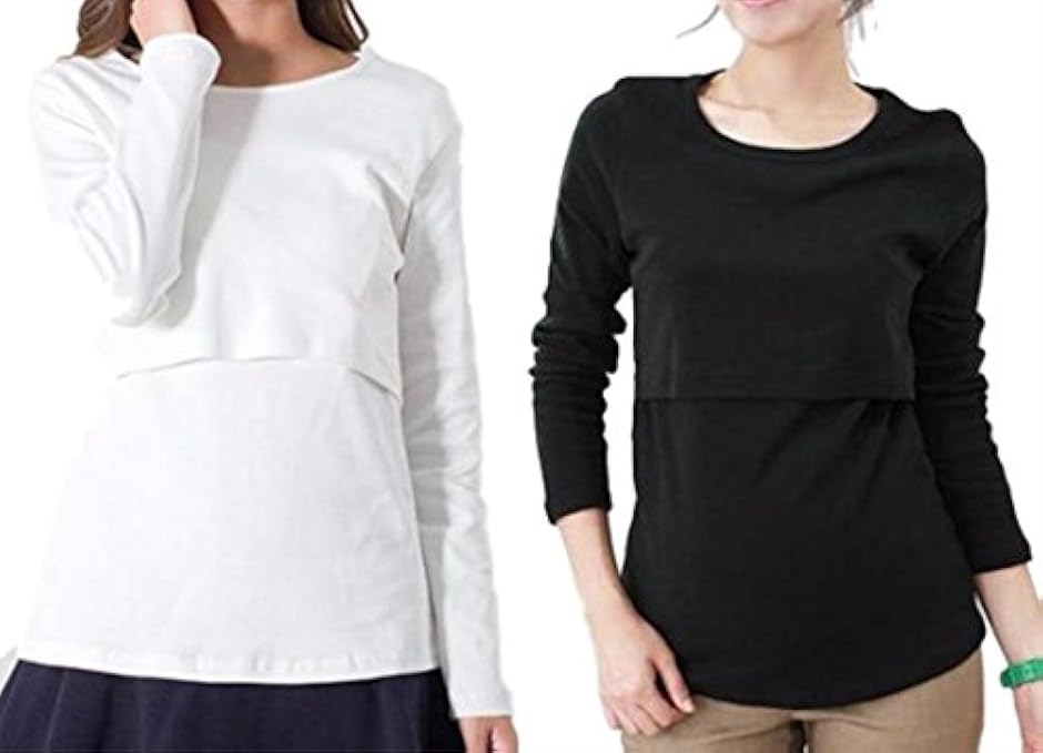 | 商品名 | 授乳服 授乳口付き 長袖 Tシャツ カットソー マタニティ ウエア 選べる カラー ロンT 2枚 セット 白 x 黒 |