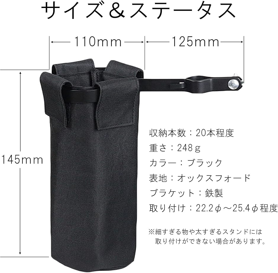 ?収納本数:20本程度 ?重さ:248g ?カラー:ブラック ?表地:オックスフォード ?ブラケット:鉄製 ?サイズ:ホルダーの直径は約110mm、高さは約145mm