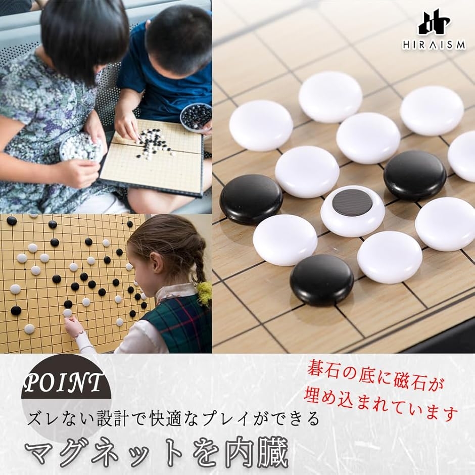 「ズレない設計で快適なプレイ」碁石の底に磁石が埋め込まれているので、磁力で碁盤と碁石がズレない程度にくっつきます。
