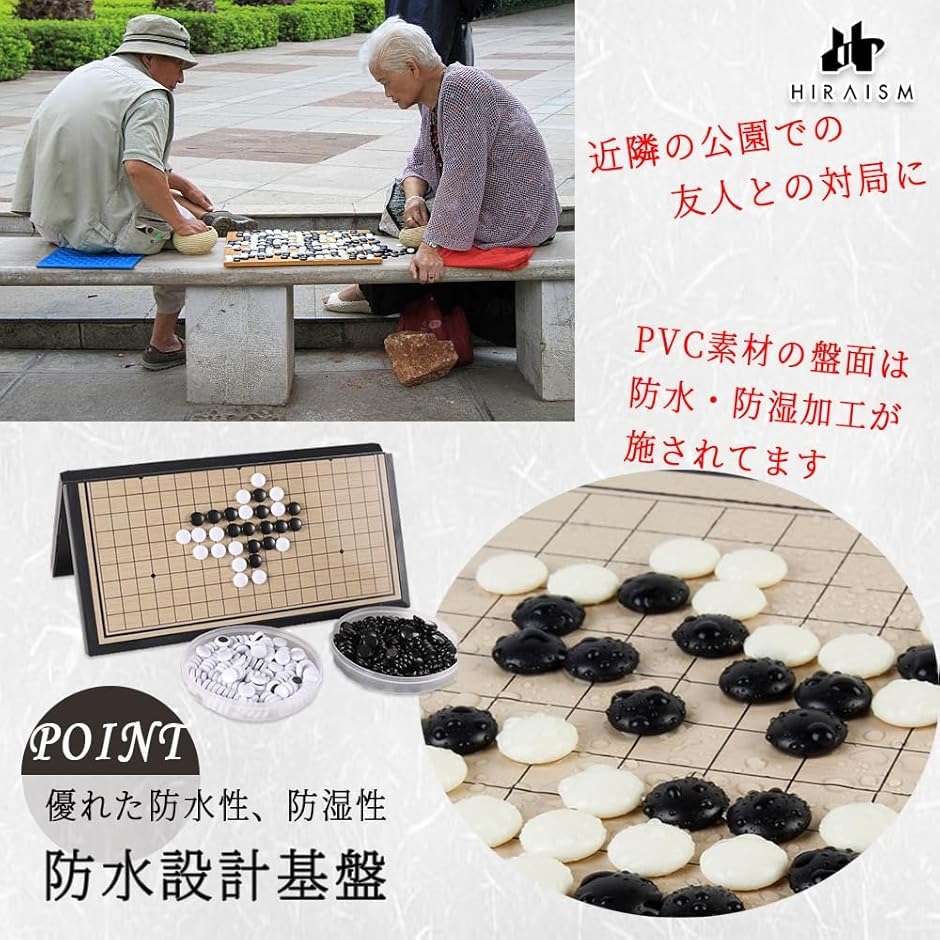「耐久性に優れた防水・防湿盤面」PVC素材の防水・防湿加工が施された盤面は、耐久性にも優れ、室内はもちろんのこと、近隣の公園での友人との対局や、アウトドアやキャンプでも使用でき、長期間の使用にも耐えます。