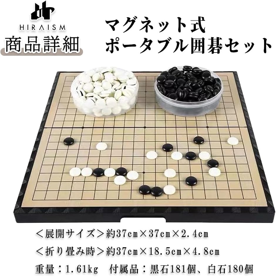 「商品内容」ポータブル囲碁セット <サイズ>37cmx37cmx2.4cm (折り畳み時)37cmx18.5cmx4.8cm <付属品> 黒石181個、白石180個