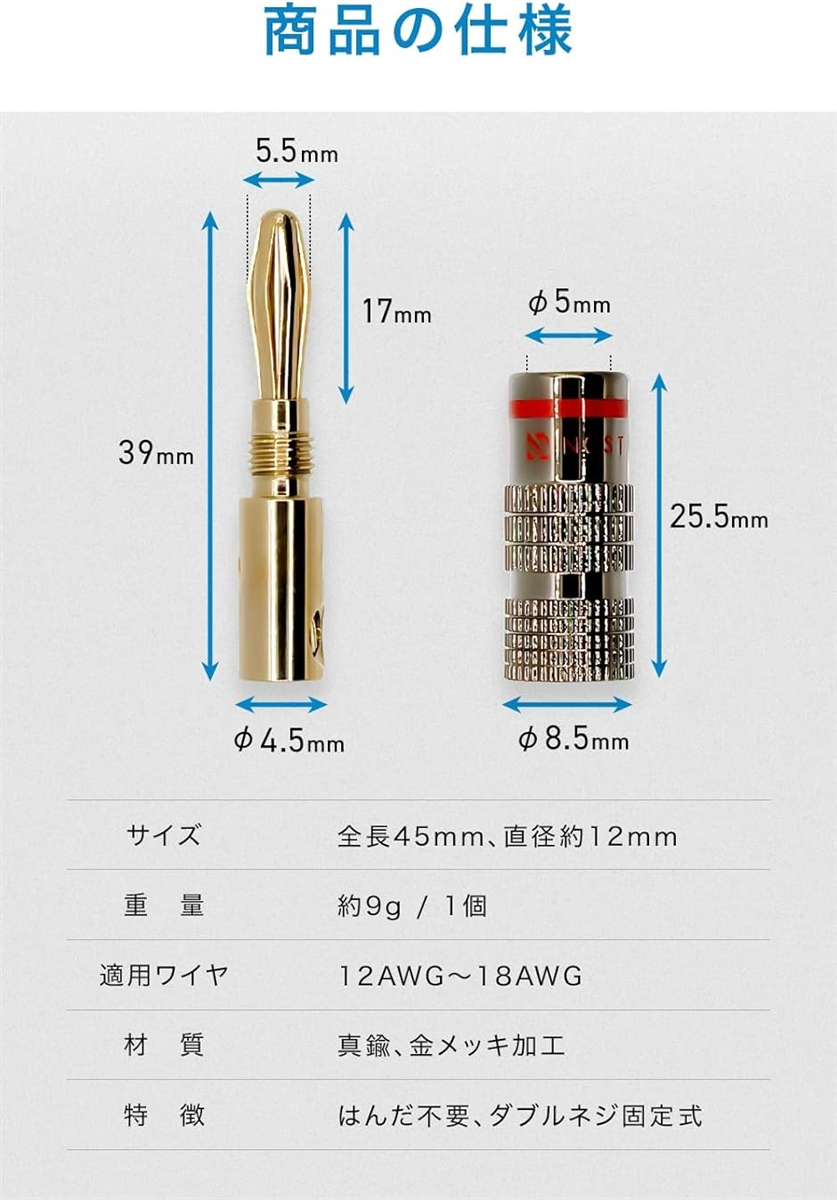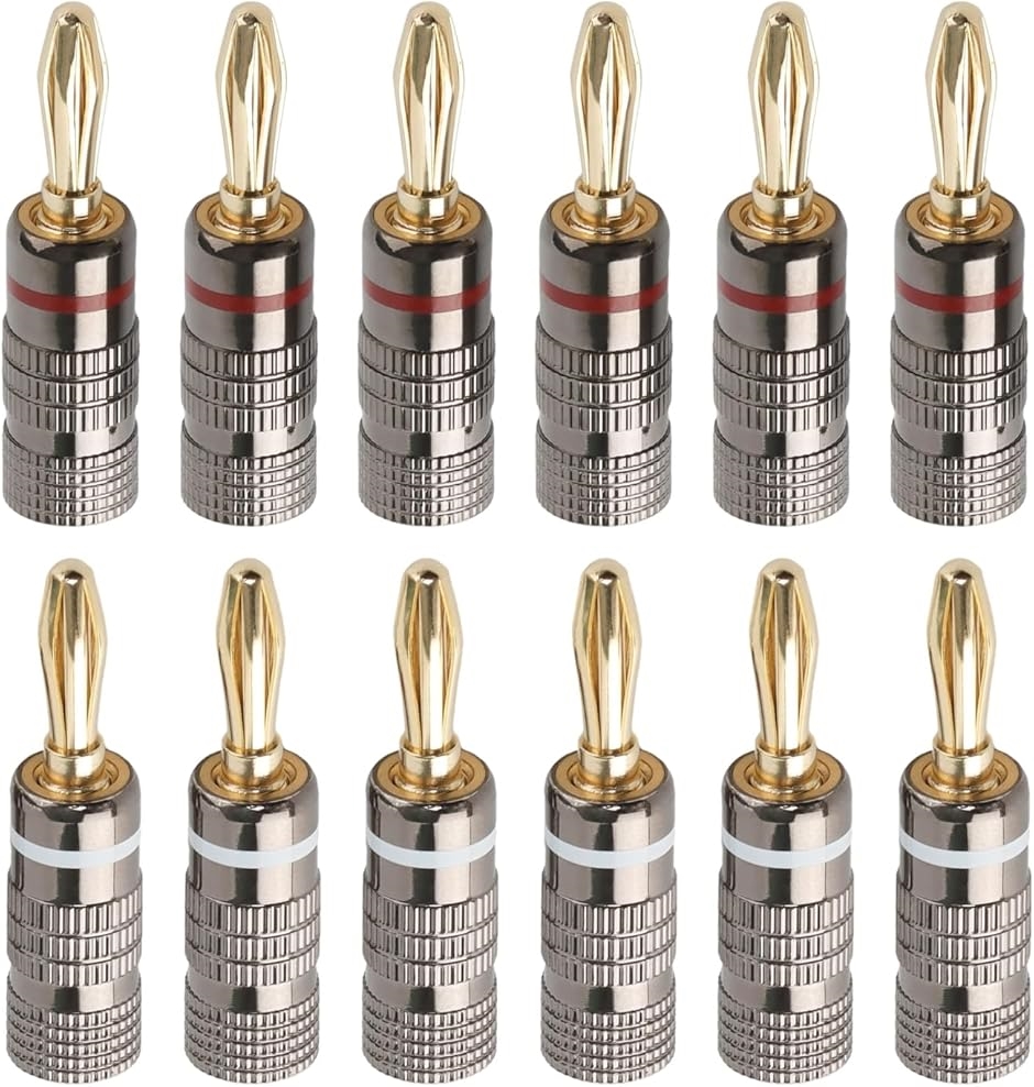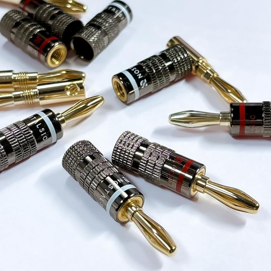 | 商品名 | バナナプラグ 赤+白セット ソルダーレス 24k金メッキ 簡単取り付け ダブルネジ固定 12AWG〜18AWG対応 オーディオ用 スピーカー/アンプ用 |