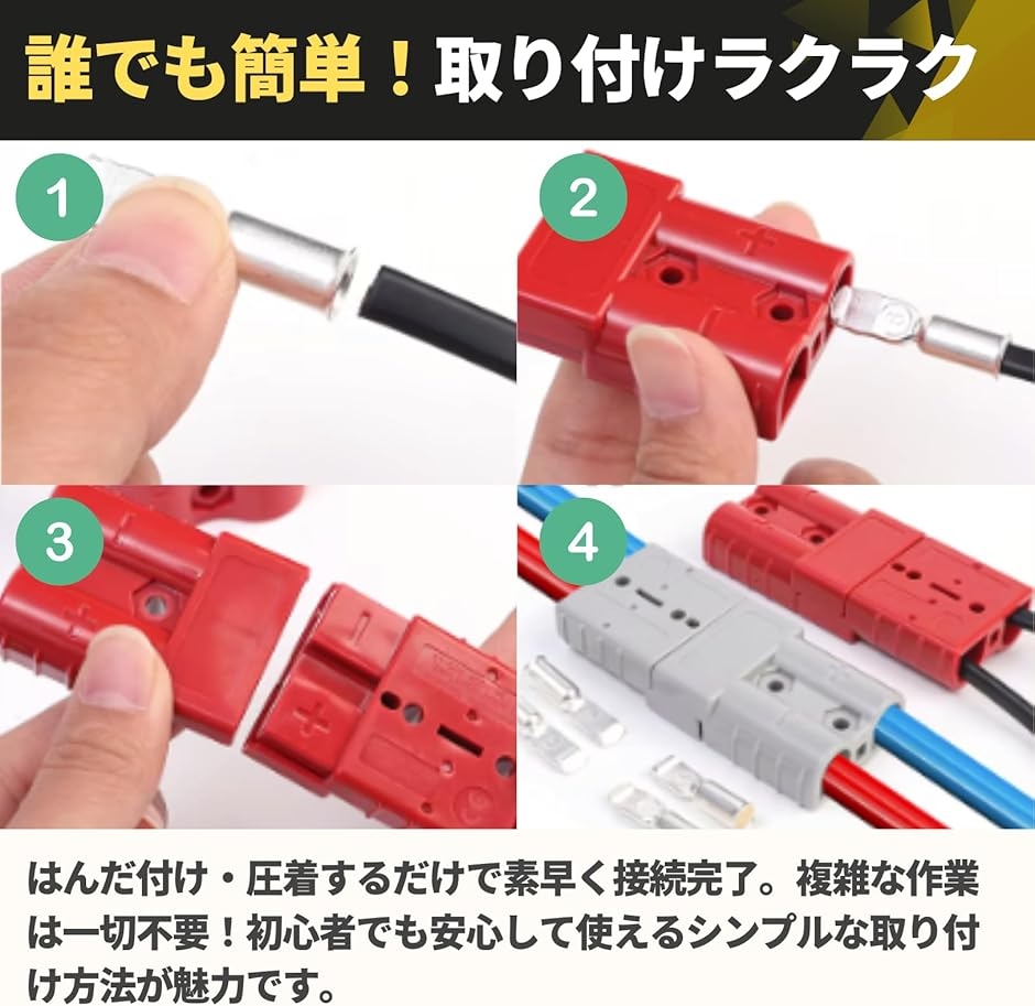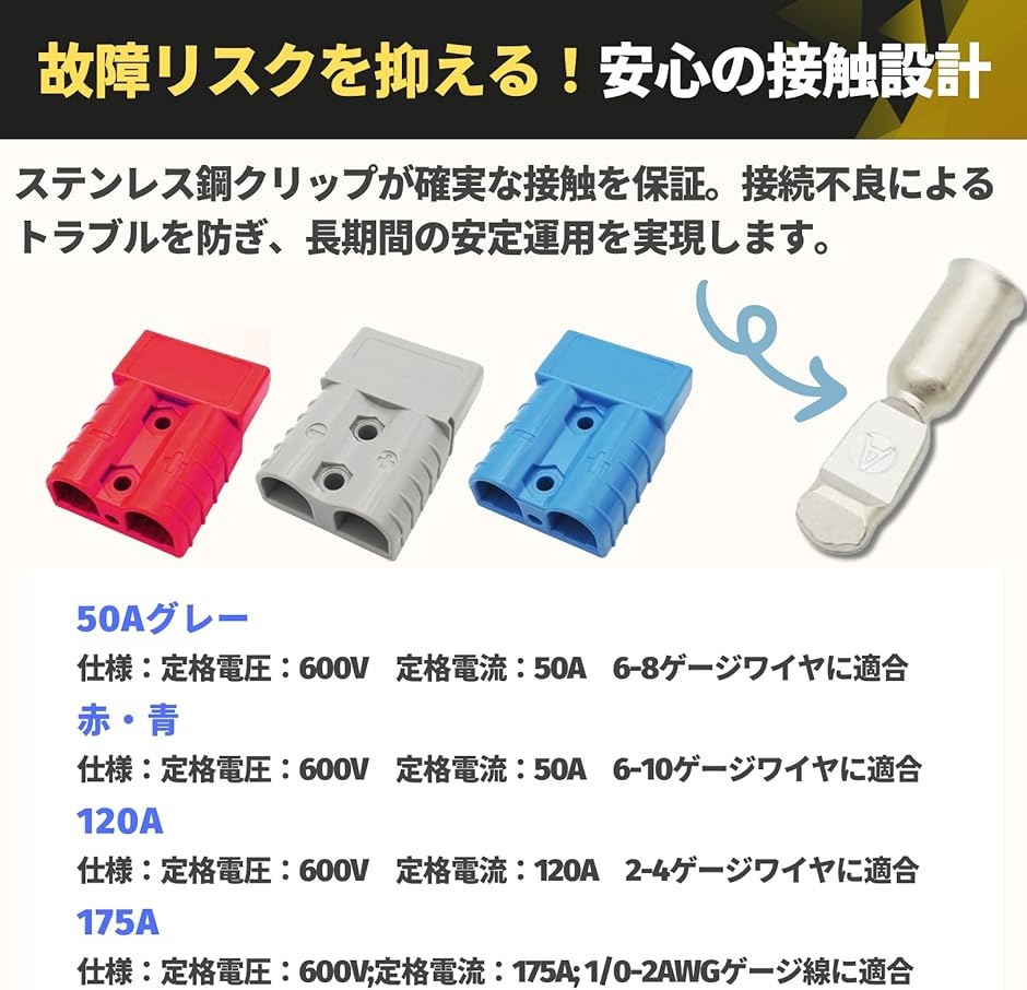 「幅広い用途に対応する高品質なアンダーソン バッテリーコネクター」 6〜10ゲージのワイヤーに適合し、素材には耐久性に優れた高品質な素材を使用。