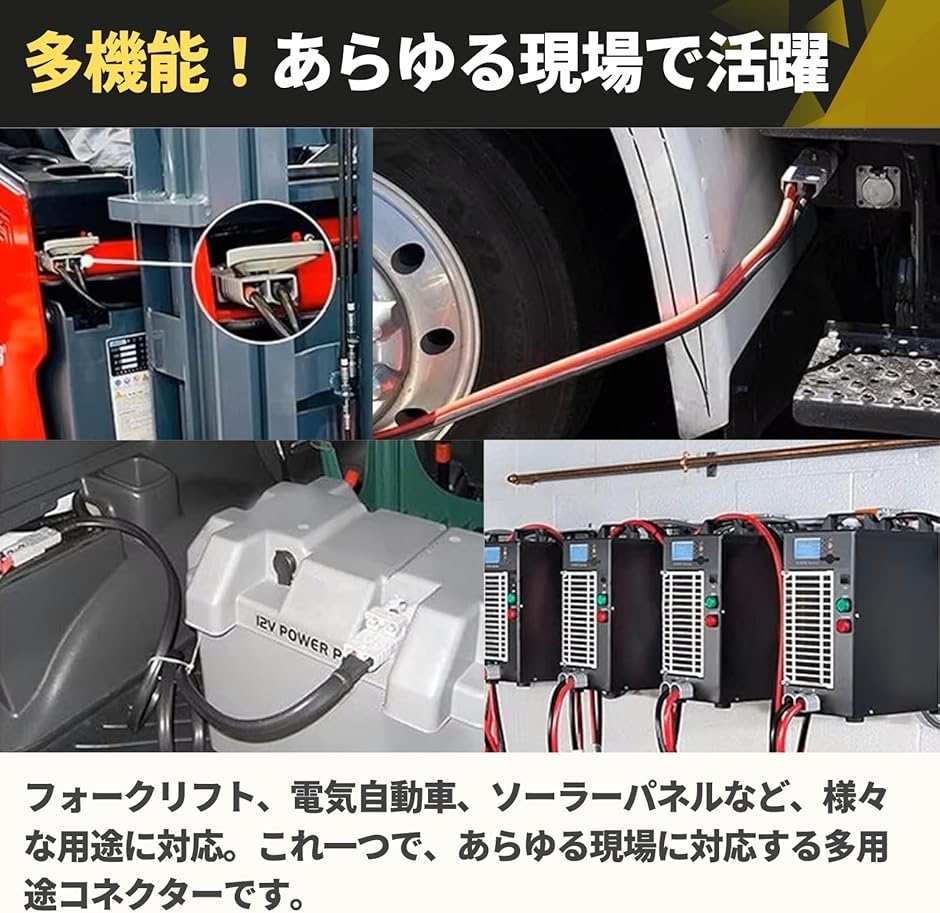 「幅広い用途」 このバッテリーコネクターは、バッテリー接続だけでなく、キャンピングカー、フォークリフト、電気自動車、ソーラーパネル、風力発電機、溶接機器など、様々な場面で活躍します。