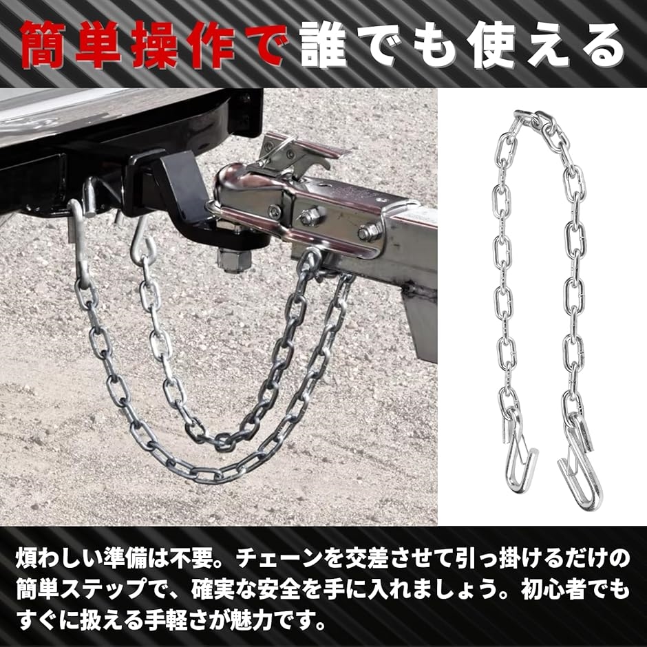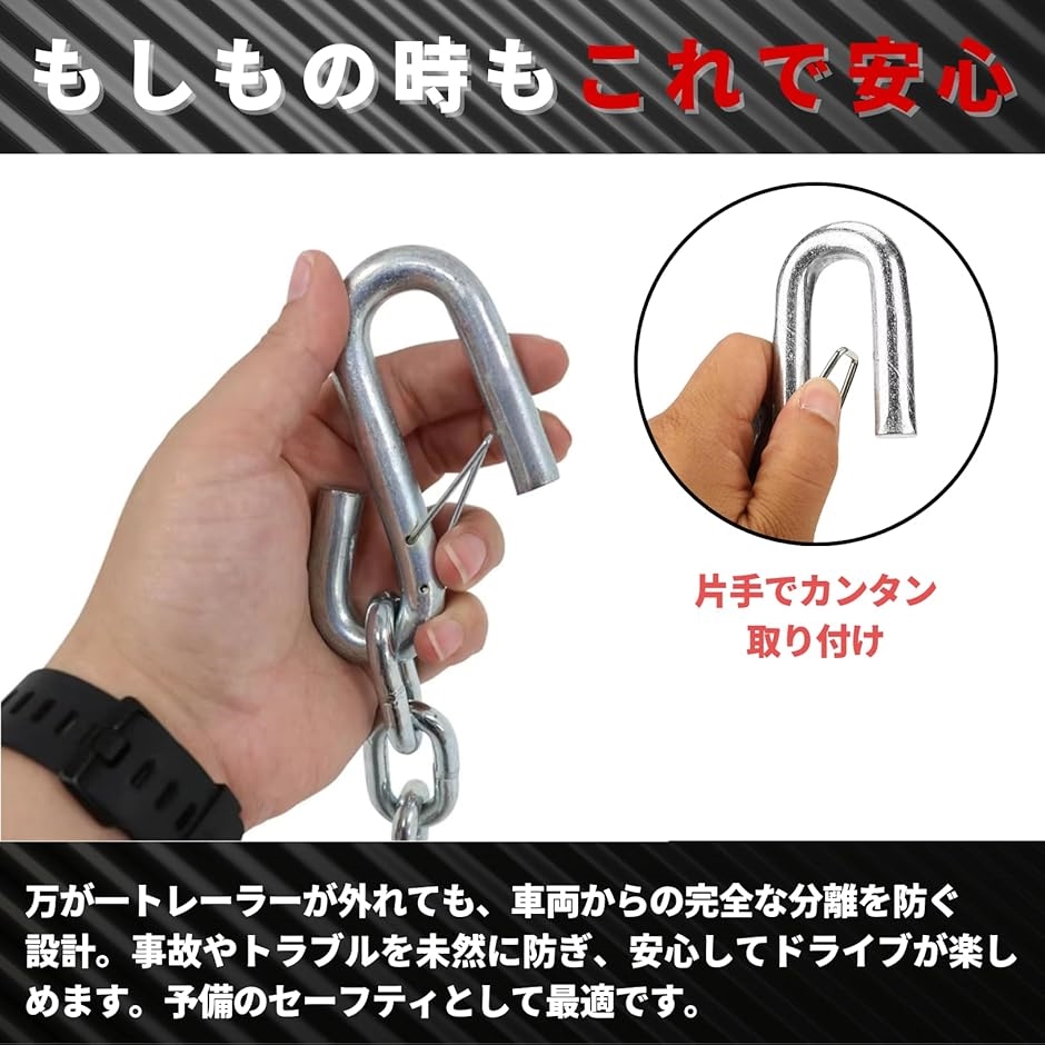 「強力な牽引力と高い耐久性」 このトレーラー安全チェーンは、最大3500ポンド(約1580kg)の重量に耐える亜鉛メッキ鋼製です。
