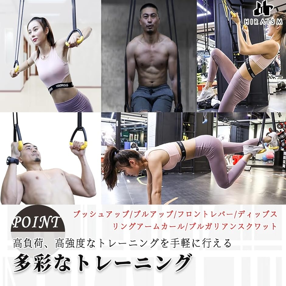 「多彩なトレーニング」プッシュアップや、プルアップはもちろん、ディップスやフロントレバー、リングアームカールなど様々なトレーニングによって、大胸筋や上腕、肩、広背筋、腹筋などの上半身を鍛えらることに加え、ブルガリアンスクワットや片足スクワットなどにより大臀筋、大腿筋といった下半身のトレーニングにも効果的に利用できます。