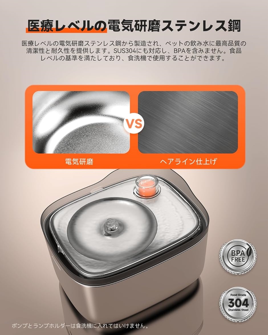 給水器は精密な電解研磨技術を採用され、従来のヘアライン仕上げステンレス製ペット水飲み器に比べ、より厚み(本製品:0.06mm、普通:0.04mm)で、お手入れも簡単、耐久性も強くて、ビスフェノールAを含まず、バクテリアの繁殖を抑制し、ぬめりを軽減することで綺麗でサラサラな水質をサポートします。