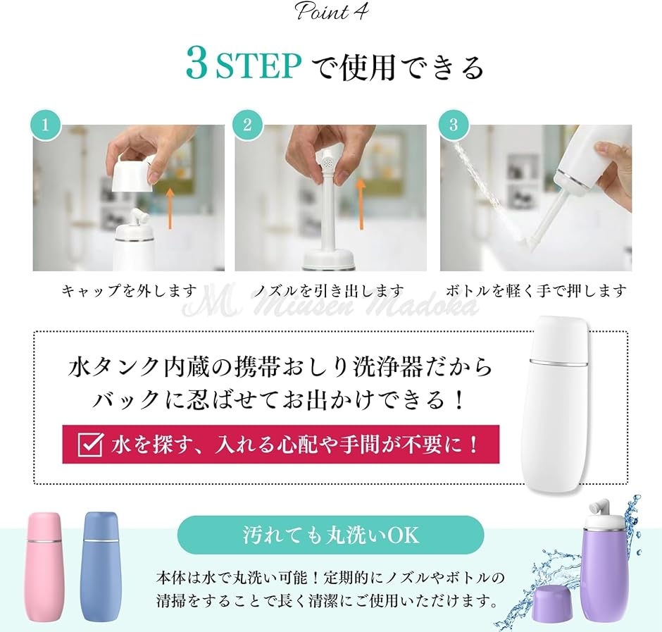 「使い方」: キャップをとってノズルを引き出し、ボトルを軽く押して内蔵の水を押し出し、洗浄します。