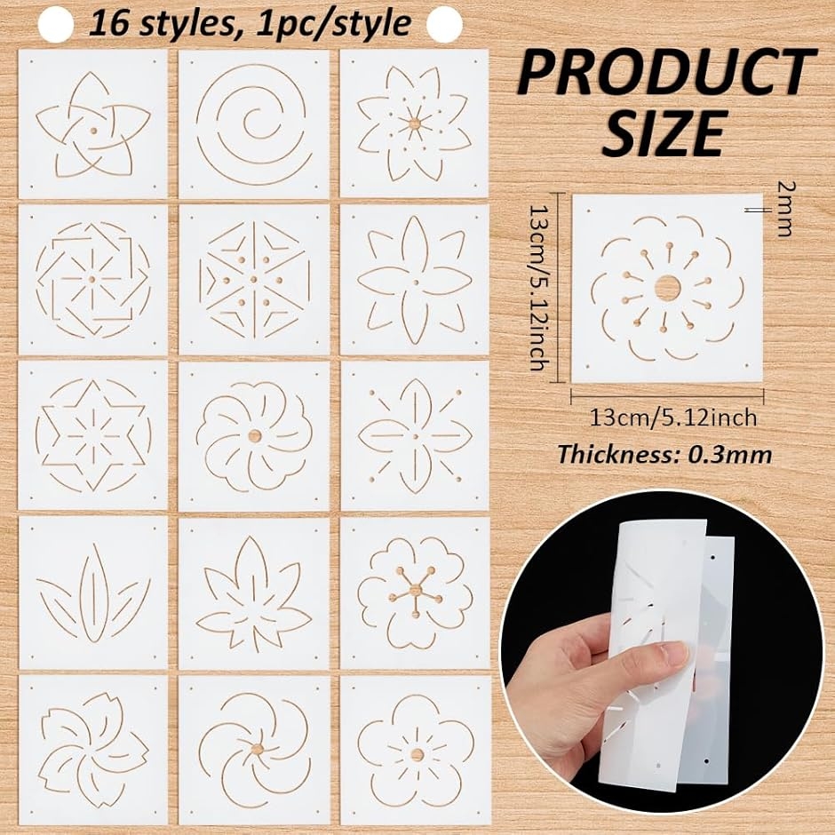 | 商品名 | 16枚 刺繍ステンシル 13x13cm 厚さ0.3mm 刺し子ステンシル 花・葉・六芒星など16スタイル PET 描画線テンプレート 絵描き道具 刺し子テンプレート |