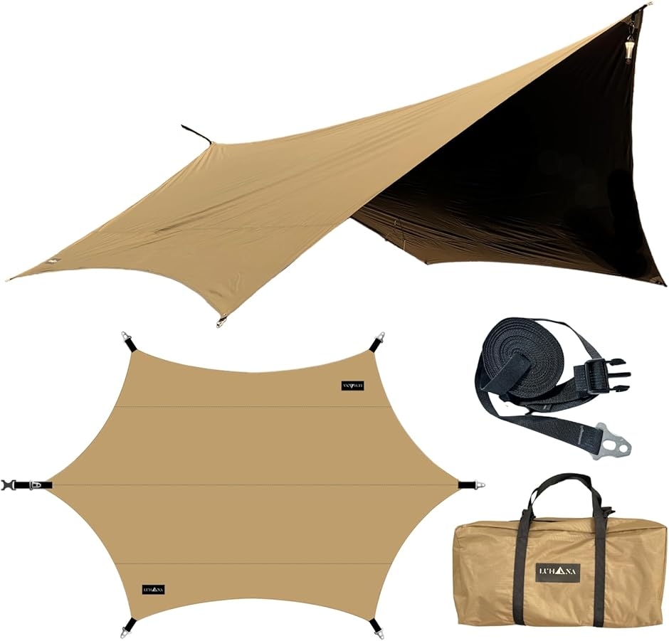 | 商品名 | タープ ヘキサタープ 難燃性ポリエステル 耐水圧8000mm ブラックコーティング 遮光 大型 5m延長ベルト付き 軽量 |