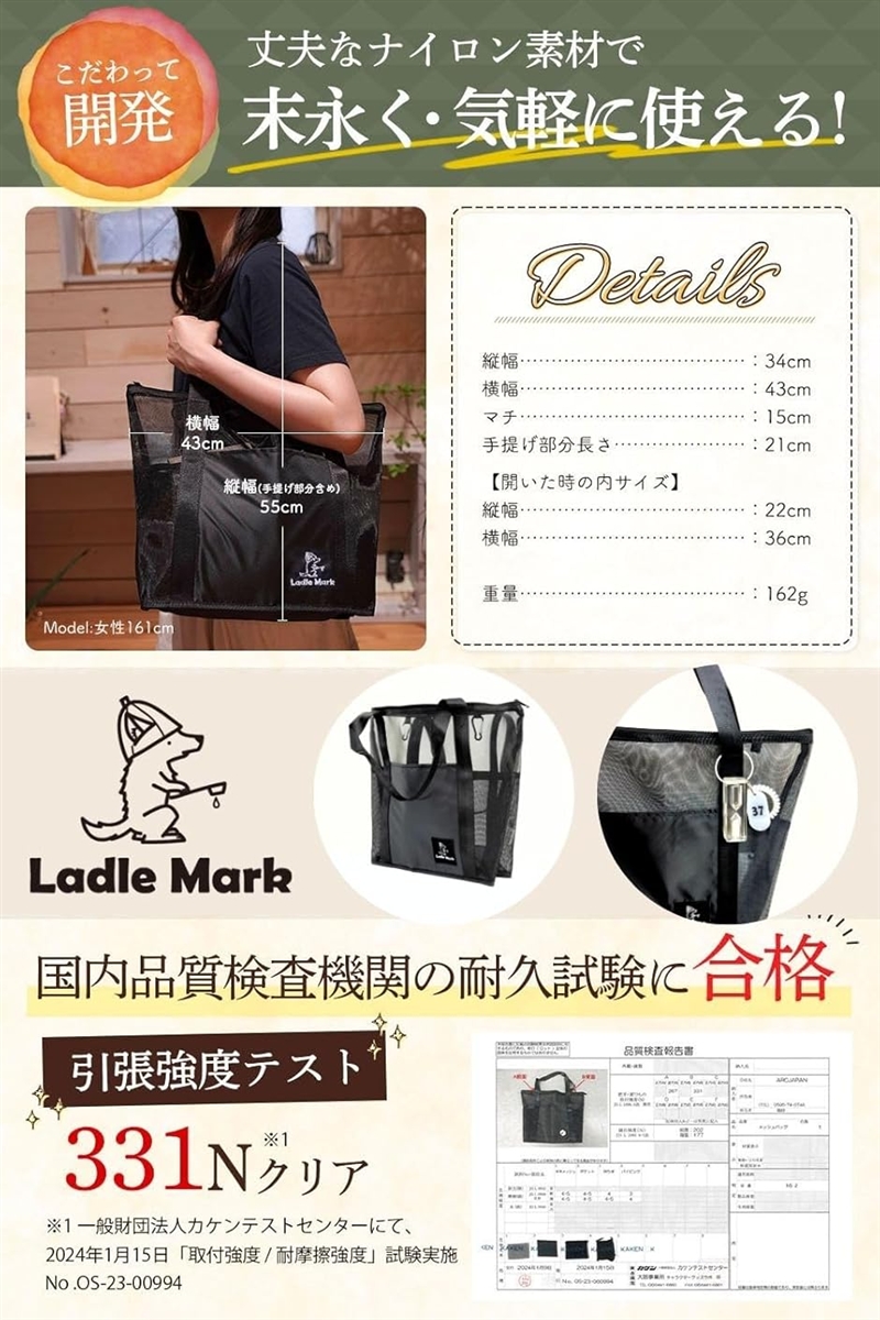 「スペック詳細」サイズ:高さ34cmx横43cmxマチ15cm 内容量:16L 素材:ナイロン 引張強度:331N