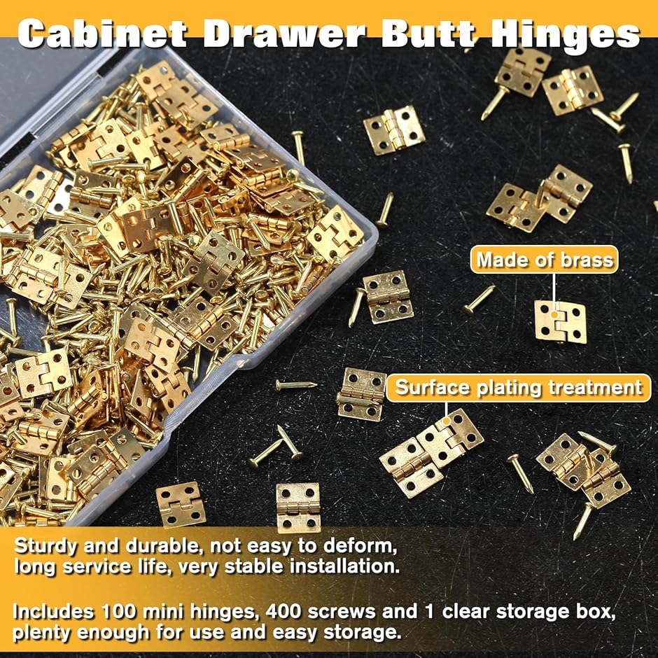 「セット内容」パッケージには、100個のミニ蝶番、400個のネジと1つの透明な収納ボックス、使用のニーズを満たすために十分な量、便利なストレージが含まれています。