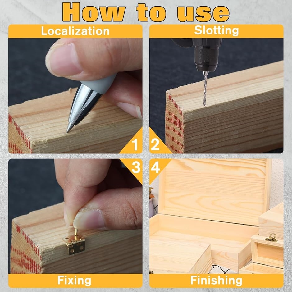 「使用方法」各ミニヒンジには4つの取り付け穴があり、使用する際は、正しい位置を選んで印を付け、穴を開けてから、ミニヒンジに付属のネジで取り付けると便利で早いです。