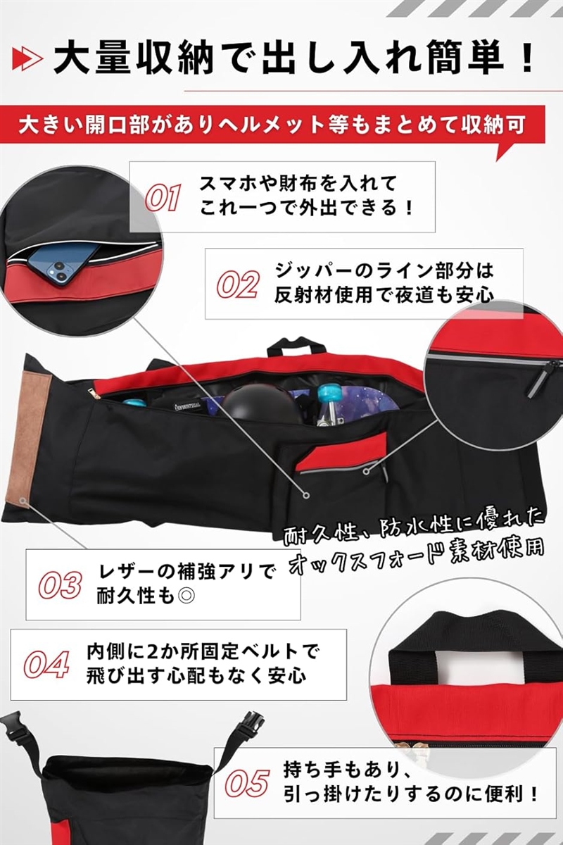 その他ヘルメットなども十分入る大きさです 「素材」防水性、耐久性に優れたオックスフォード生地を使用 「カラー」 ・「ブラック」:ブラックのシンプルな中にゴールドのジッパーが映えるデザイン。
