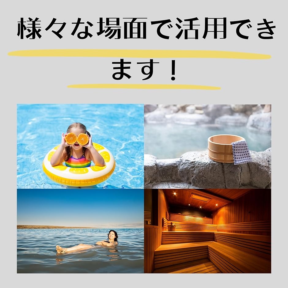 ・お風呂、温泉、サウナ、岩盤浴、プール、水泳、海水浴、ジム、スパ など様々な場面で活用できます。
