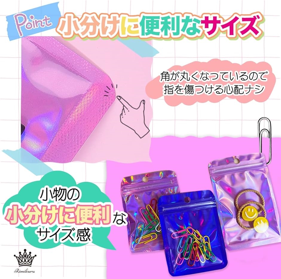 「幅広い用途で使える」こちらのオーロラ チャック袋 は缶バッジなどの小物やジュエリー、イヤリング、ブローチ、指輪、イヤリング、工芸品、アクセサリーなど様々なものを整理・収納できるので家庭や学校、オフィスなど場所を問わず様々なシチュエーションでお使いいただけます。