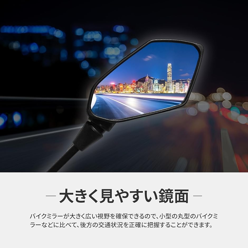 バイク ミラーが大きく広い視野を確保できるので、小型の丸型のバイクミラーなどに比べて、後方の交通状況を正確に把握することができます。