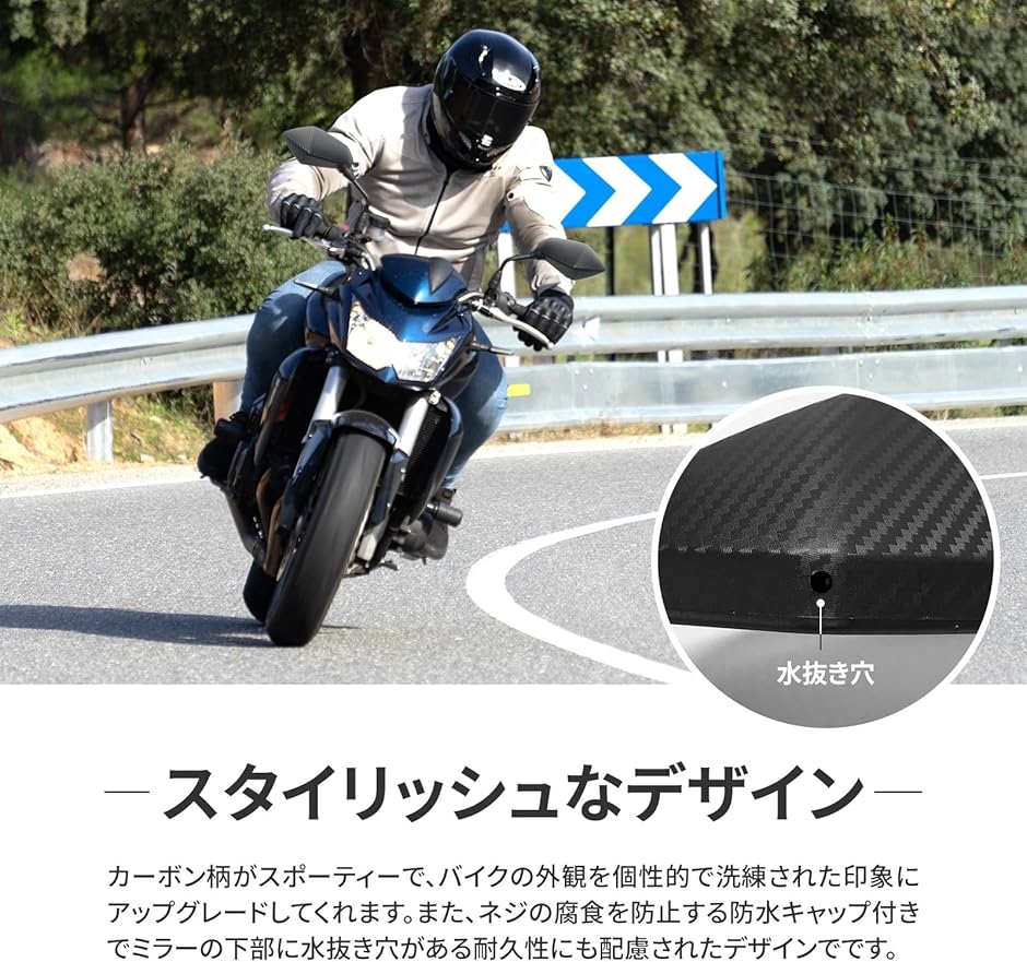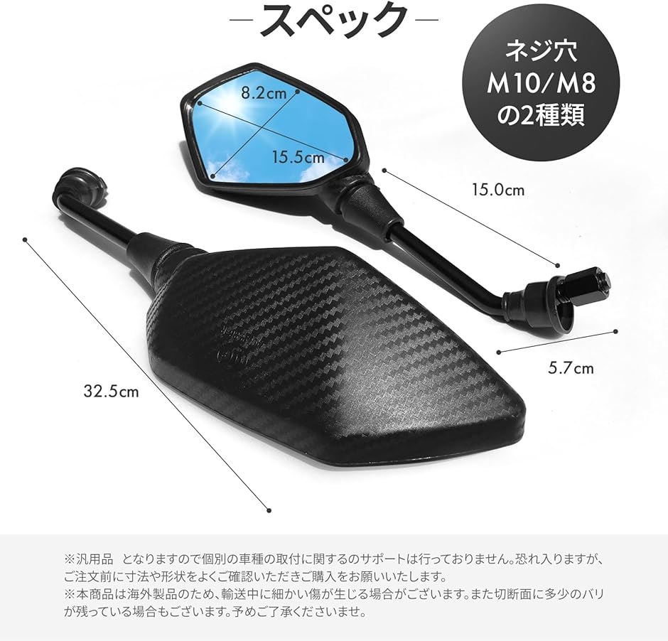 | 商品名 | バイク ミラー 8mm カーボン調 左右セット 汎用 サイド バック オートバイ 原付き スクーター カスタム 正ネジ ブラック M8 |