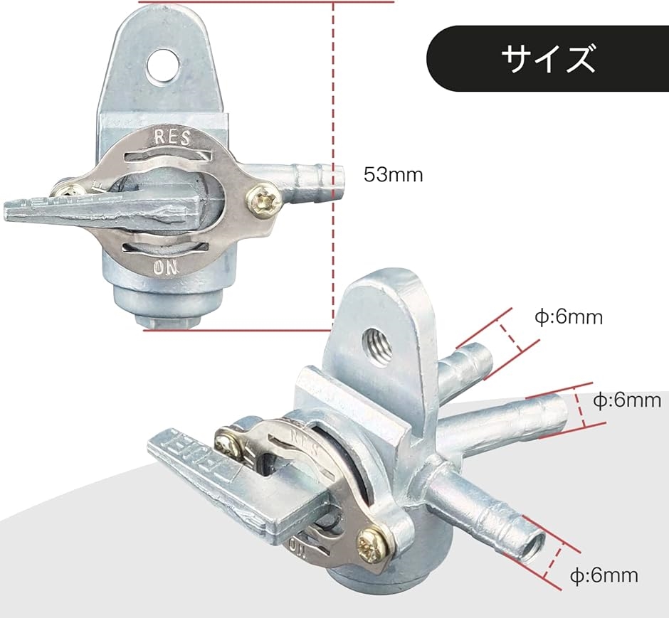 ここにON(流入)、OFF(流入止め)、RES(リザーブ・燃料が残り少ないときの切り替え)の各位置を選べるレバーが付き、その都度切り替えて使用するものです。