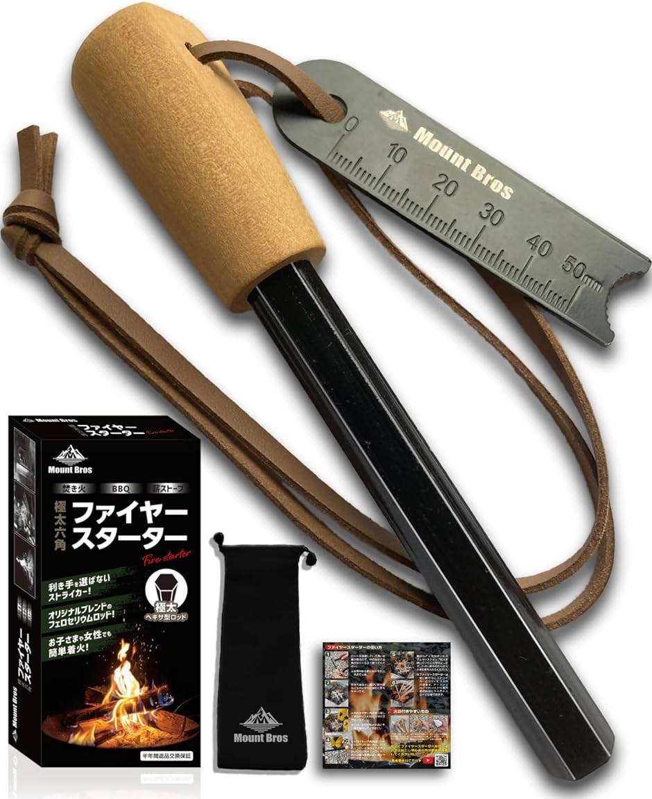 | 商品名 | ファイヤースターター MountBros フェロセリウム 六角 長い メタルマッチ 取説収納袋セット レザーコード 小サイズ |