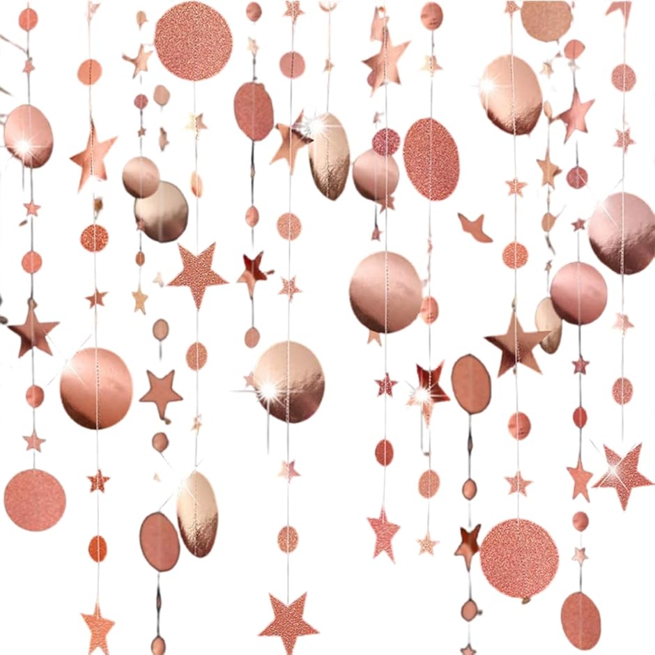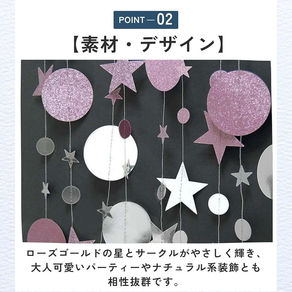 「素材・デザイン」ローズゴールドの星とサークルがやさしく輝き、大人可愛いパーティーやナチュラル系装飾とも相性抜群です。