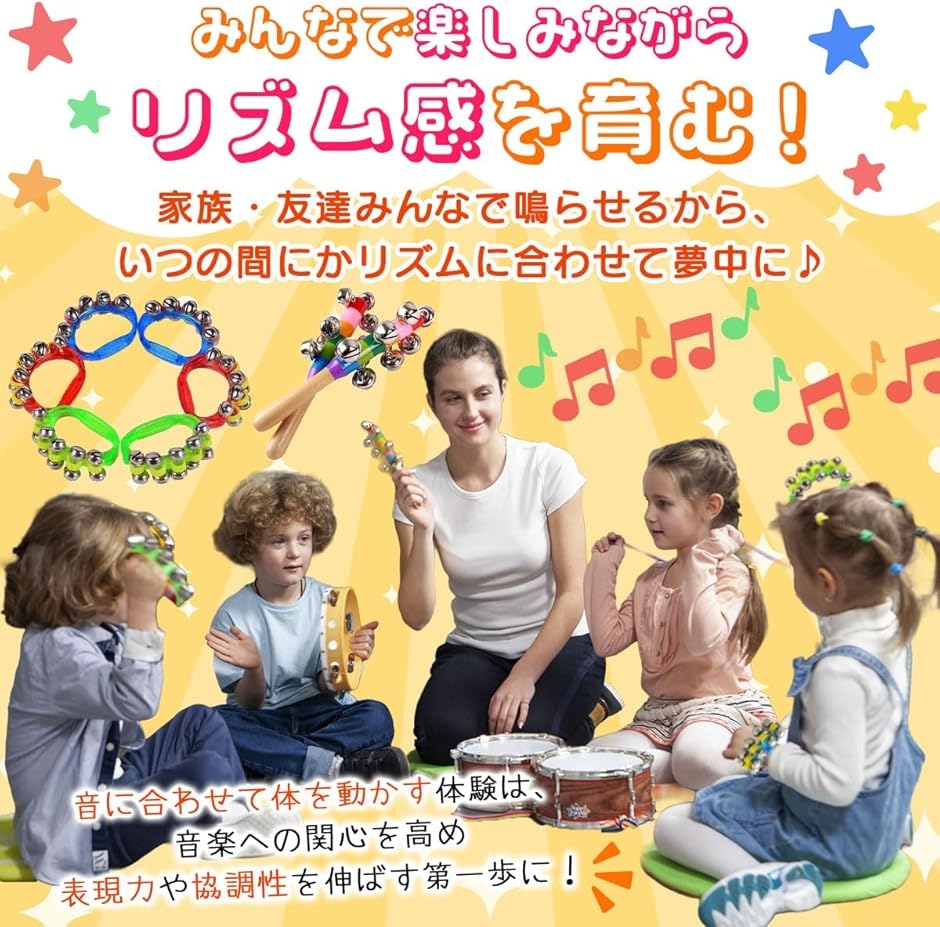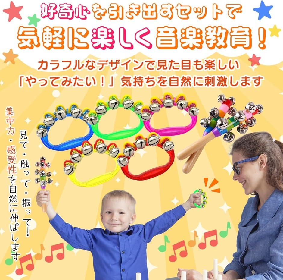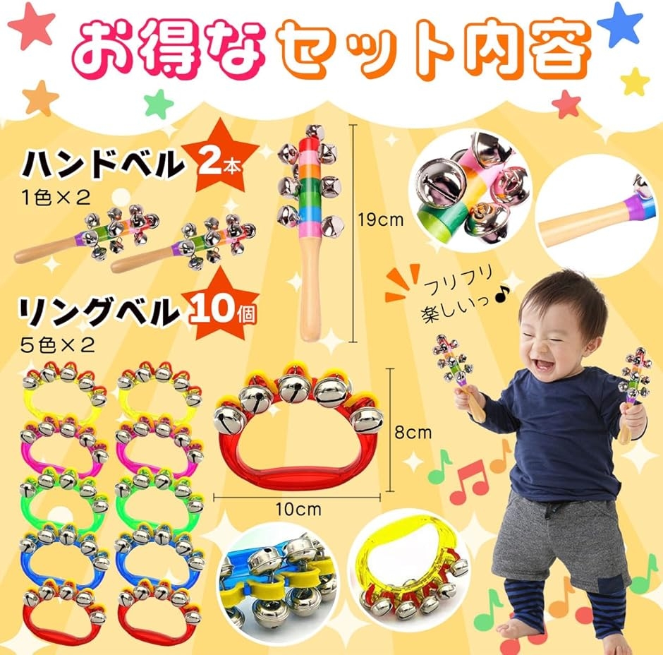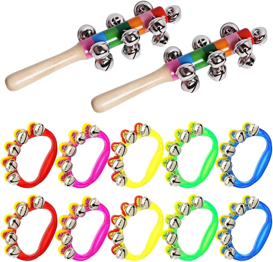 「商品詳細」 <セット内容>:リングベル10個(5色x各2個)、ハンドベル(スレイベル)2本 <リングベルサイズ>:約8x10cm <ハンドベル長さ>:約19cm <素材>:木材・金属・プラスチック <用途>:音楽あそび、リトミック、発表会、パーティー、イベント *対象年齢6歳以上