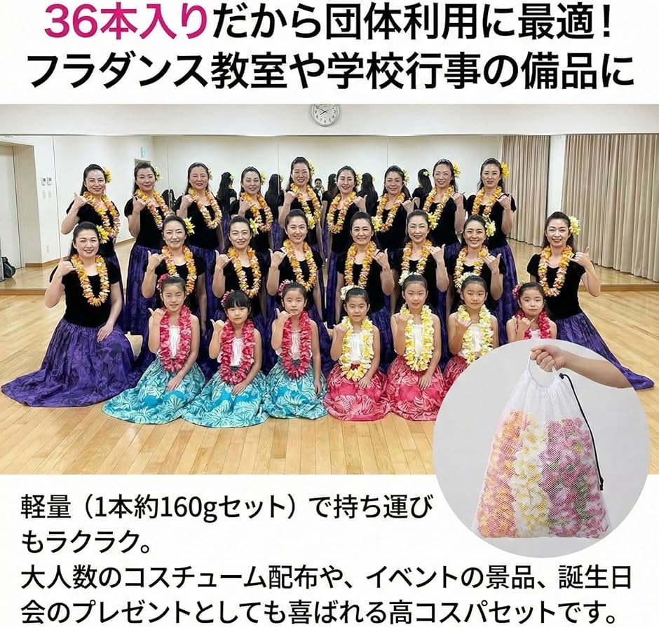 ボリュームたっぷりの首飾りは、フラダンスの練習や発表会を華やかに演出します。