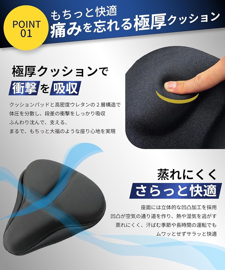 「痛くない超肉厚4.5cmクッションでもちっと衝撃吸収 長時間の走行でもお尻が痛くなりにくい、超極厚4.5cmクッション。