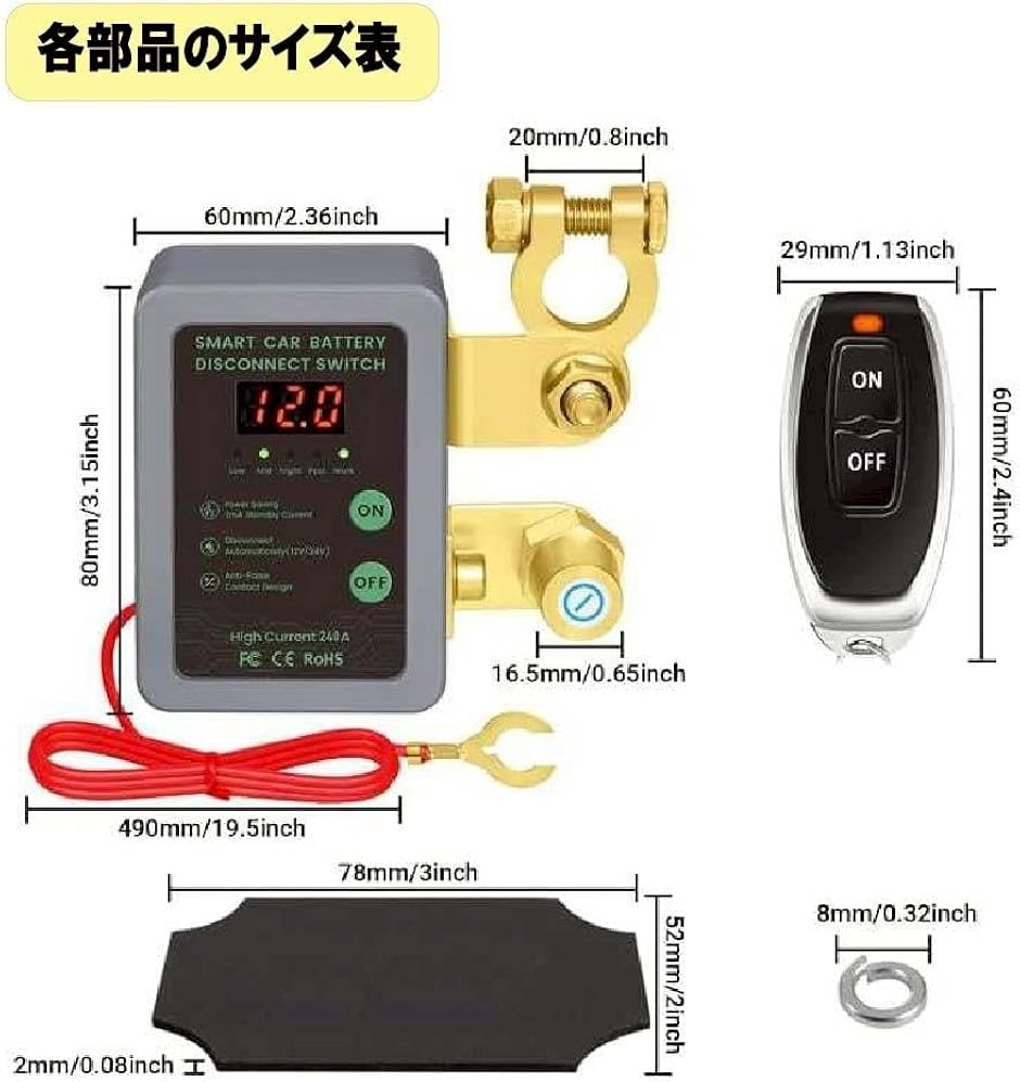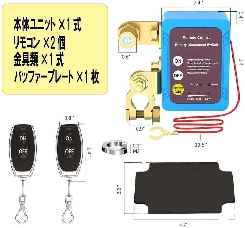 「商品内容」・本体x1・リモコンx2・金具類x1式・バッファープレートx1「仕様」・ バッテリー切断スイッチ定格電流:240A・定格電圧:12V・スタンバイ消費電力:3mA・電源オフしきい値:11.8V±0.2V・瞬間電流:500A