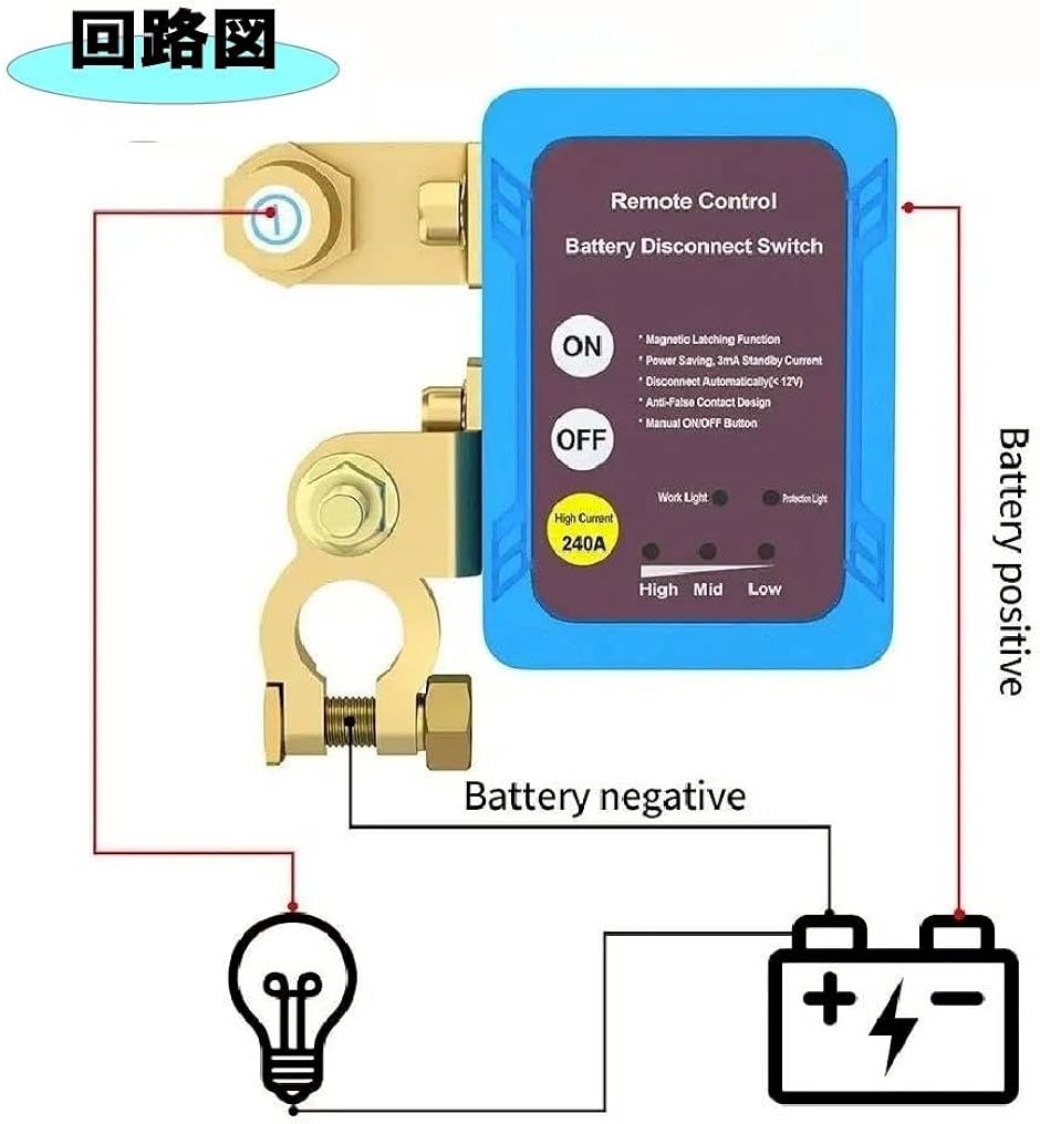 電圧が13.2Vを超える場合は、運転中に誤って電源を切るのを防ぐためにリモートコントロールが無効になり、電源はスイッチのボタンでのみ制御が可能です「磁気ラッチ機能」・本商品は、磁気原理で回路の切断とカットオフを制御する新しいタイプのリレーを使用しており、スタンバイ電流は3mAでとても省エネです。