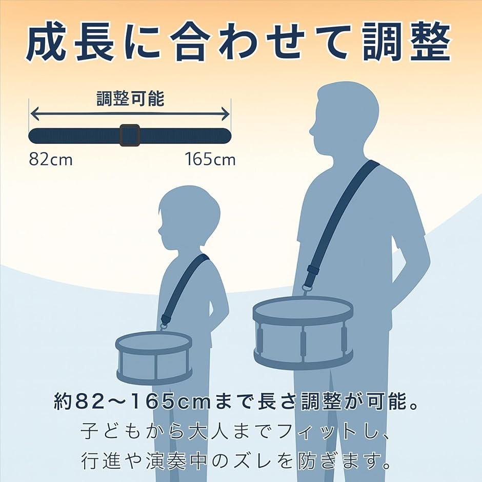 スネアストラップとしても太鼓ベルトとしても使用でき、子ども鼓笛隊や学校用の演奏会、お遊戯会にも最適です。