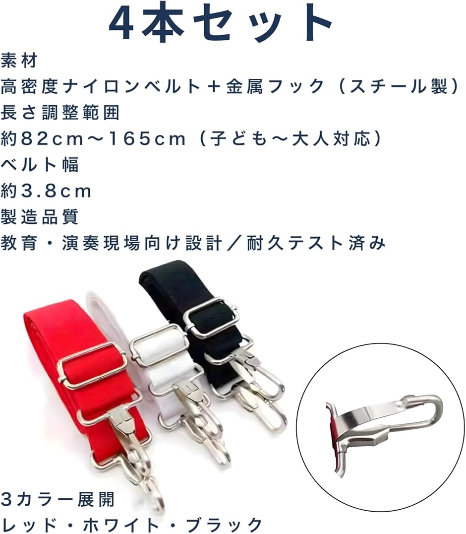 | 商品名 | スネアドラム ストラップ 4本セット 鼓笛隊 太鼓 マーチングドラム 幅広3.8cm 調整可能 高密度ナイロン 肩掛け ベルト |
