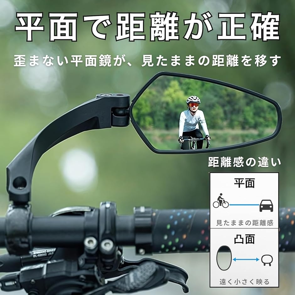 「視界が変わる、走りが変わる」 ドナリーの自転車ミラーは、平面鏡による歪みのない映像で、後方の車や歩行者との距離を正確に把握できます。