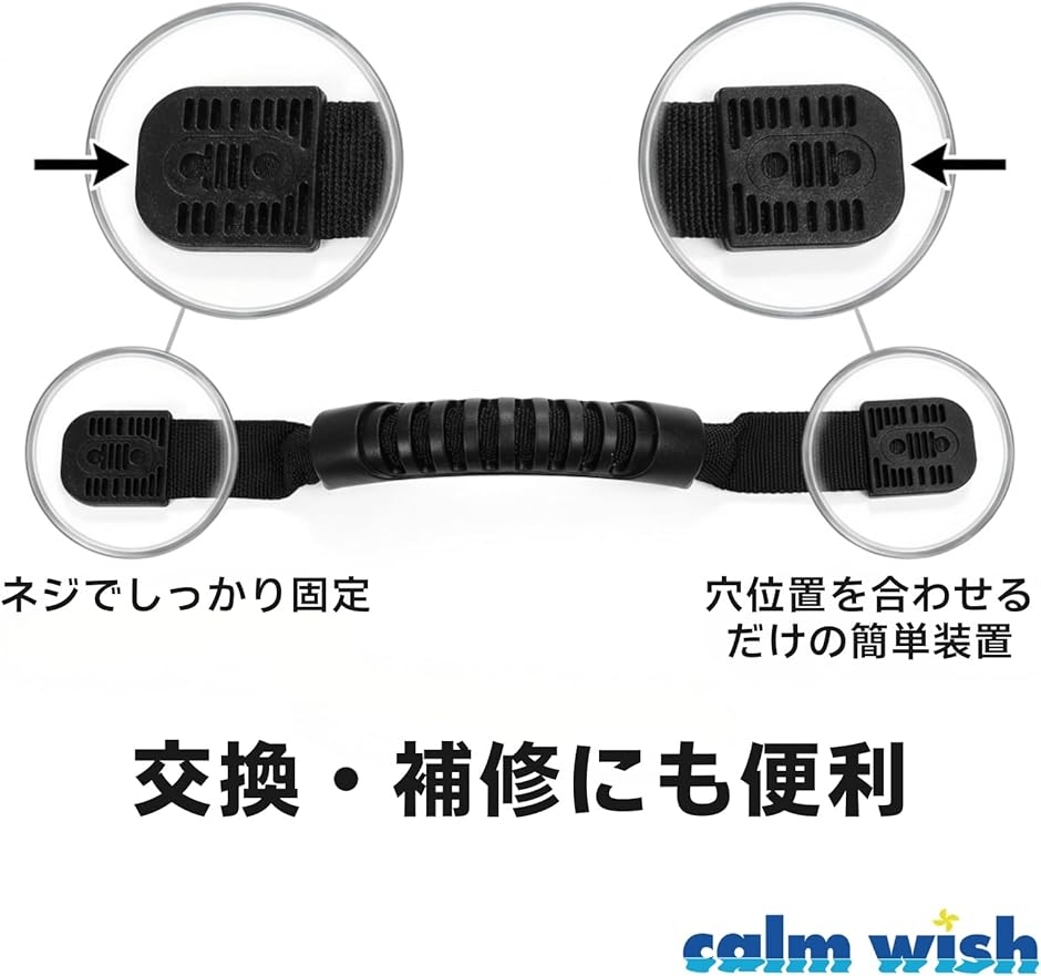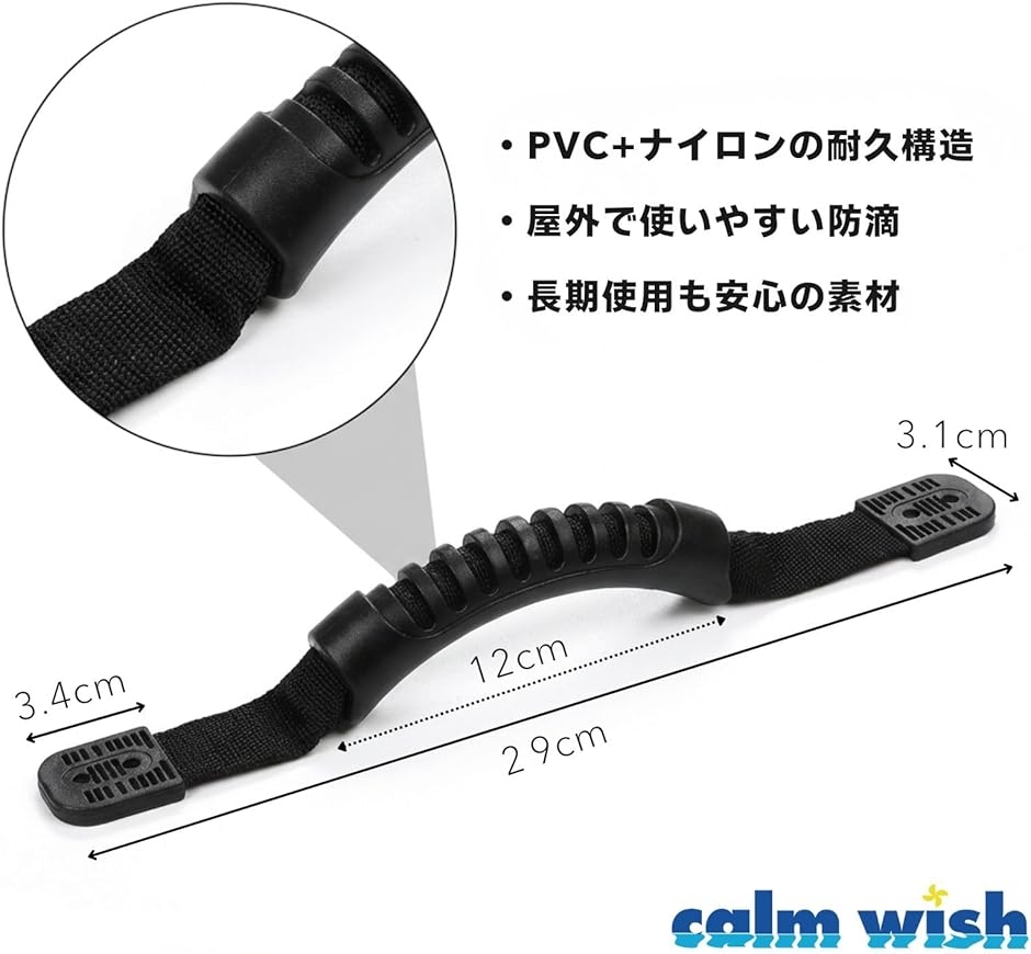 | 商品名 | カヤック キャリー ハンドル カヌー ゴム ボート ブラック 4本セットネジ付き ロープ 取っ手 滑り止め 交換 修理 荷物 運搬 DIY |
