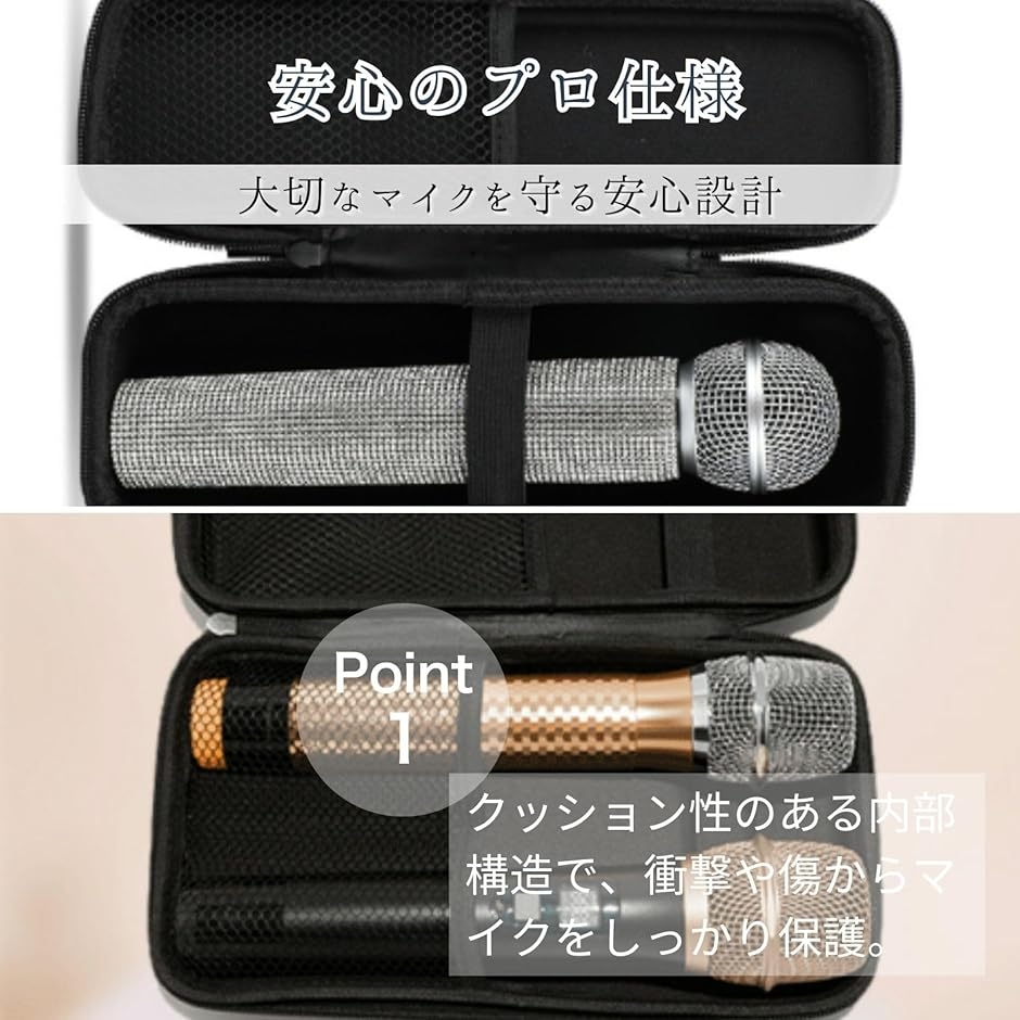 「大切なマイクを守る安心設計」防水・防振・衝撃吸収の三重構造で、移動中のトラブルからマイクをしっかり保護。