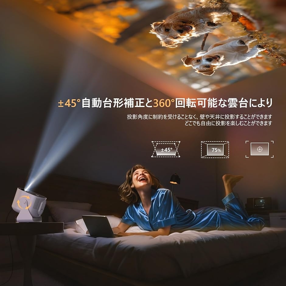 | 商品名 | プロジェクター 家庭用 小型 天井投影 自動台形補正 バッグ付360回転 デザリング対応 スマホ接続 32000lm 700ANSI WiFi/双方向Bluetooth 電動フォーカス |