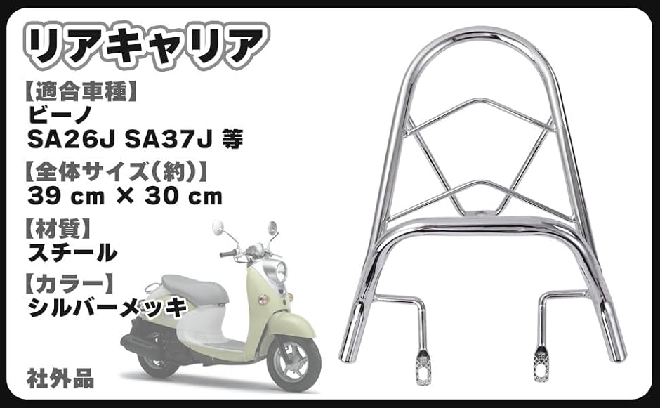 | 商品名 | ヤマハ 用 リアキャリア メッキ 4st ビーノ SA26J SA37J YAMAHA バイク 荷台 汎用 社外品 カスタムパーツ |