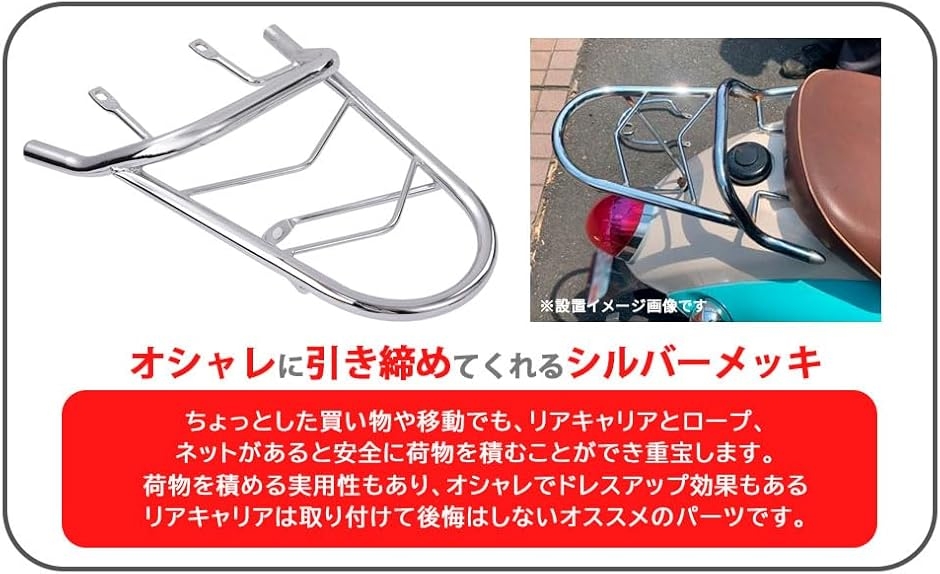 シルバーメッキのリアキャリアを取り付ける事により引き締まって、バイクのスタイルもオシャレにカッコよく見えるドレスアップ効果もあります。