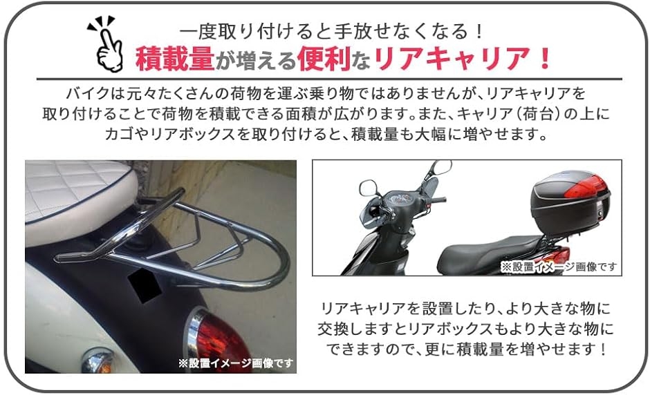 バイクは元々たくさんの荷物を運ぶ乗り物ではありませんが、リアキャリアを取り付けることで荷物を積載できる面積が広がります。