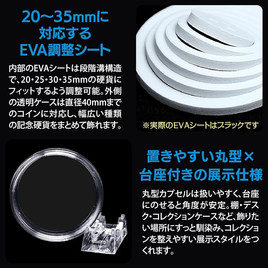 | 商品名 | コインカプセル 台座付 透明プラ 収納ケース EVA調整 記念硬貨の保管 展示用 |