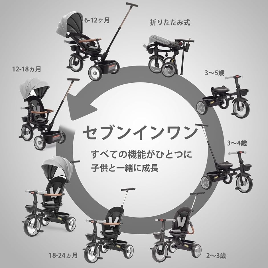 1.ベビーカー(横になれる) 2.ベビーカー(座れる) 3.三輪車(サンシェード&押し棒&背もたれ&ベルト付き) 4.押し棒付き三輪車 5.押し棒を外して通常の三輪車 6.安全ベルト付き三輪車 7.収納と展開できるステップ機能追加。