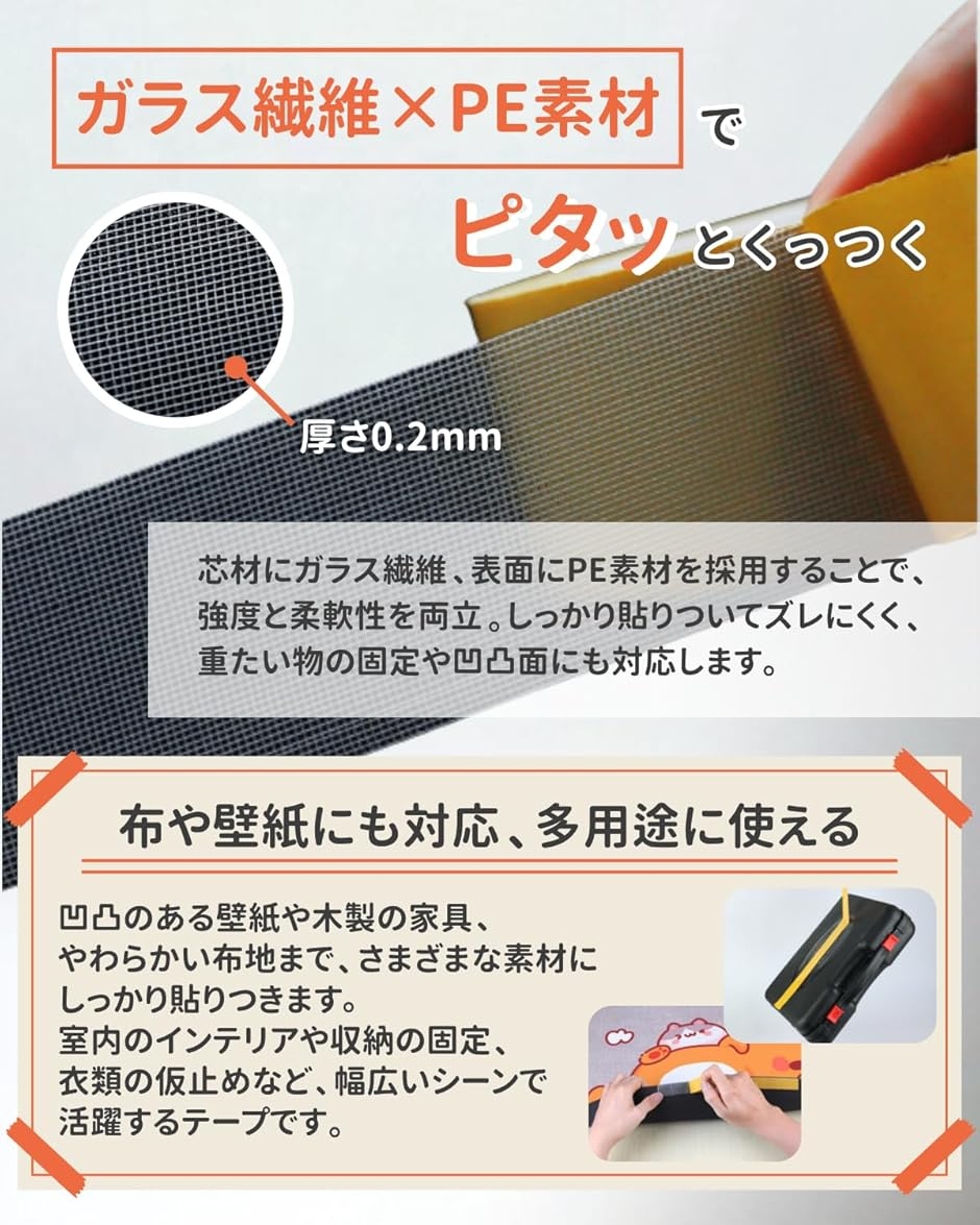 「壁紙や布にも使える多用途性が魅力」布用 両面テープや壁紙 両面テープとしても使える優れた粘着力を実現。