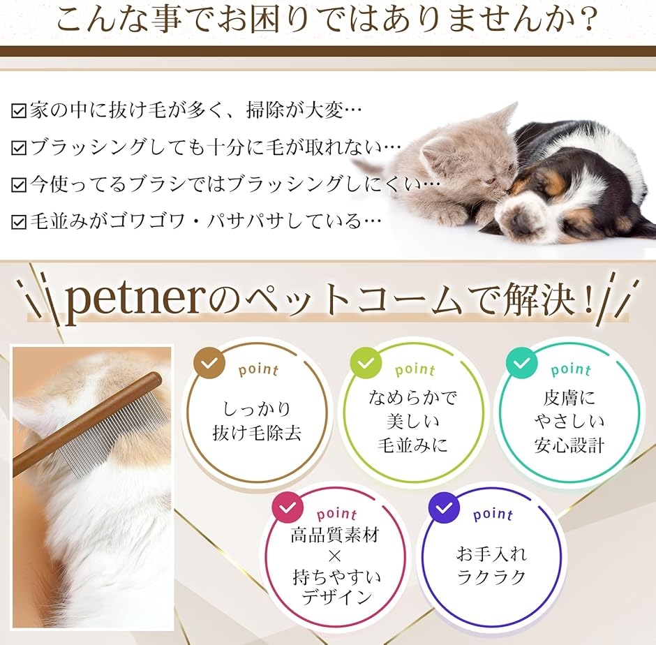 「皮膚にやさしい安心設計。 敏感なペットにも最適」 「先端が丸いクシ歯を採用しており、デリケートなペットの皮膚を傷つける心配がありません。