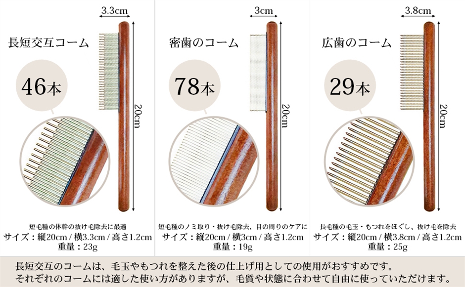 「製品情報」 長短交互コーム(46本)縦20cm横3.3cm高さ1.2cm 密歯のコーム(78本)縦20cm横3cm高さ1.2cm 広歯のコーム(29本)縦20cm横3.8cm高さ1.2cm